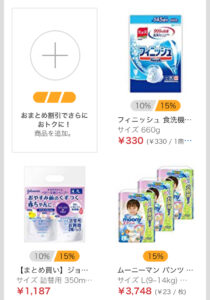 洗剤とボディシャンプーのところに「10%」「15%」という表記がありますが、おむつとおしりふきを除く対象商品数が3点以上だと15%のおまとめ割が適用されます。