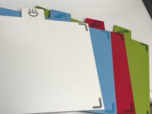 左上に絵がついているので、色で覚える必要がなく、使いたい食材別でまな板を出せば良いので簡単です。