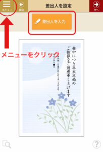 ご自身の住所や氏名を表面に入れたい場合は上にある「差出人を入力する」、ないときは左上にある「メニュー」をクリックし、「差出人を入力する」ボタンをクリックします。