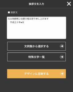 文例集から選び、変更してから「デザインに反映する」を選ぶと選んだはがきに反映されます。