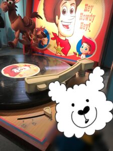 その右手にはトイストーリー2のウッディとジェシー、ブルズアイがいて、レコードの上に乗って写真を撮れます。
